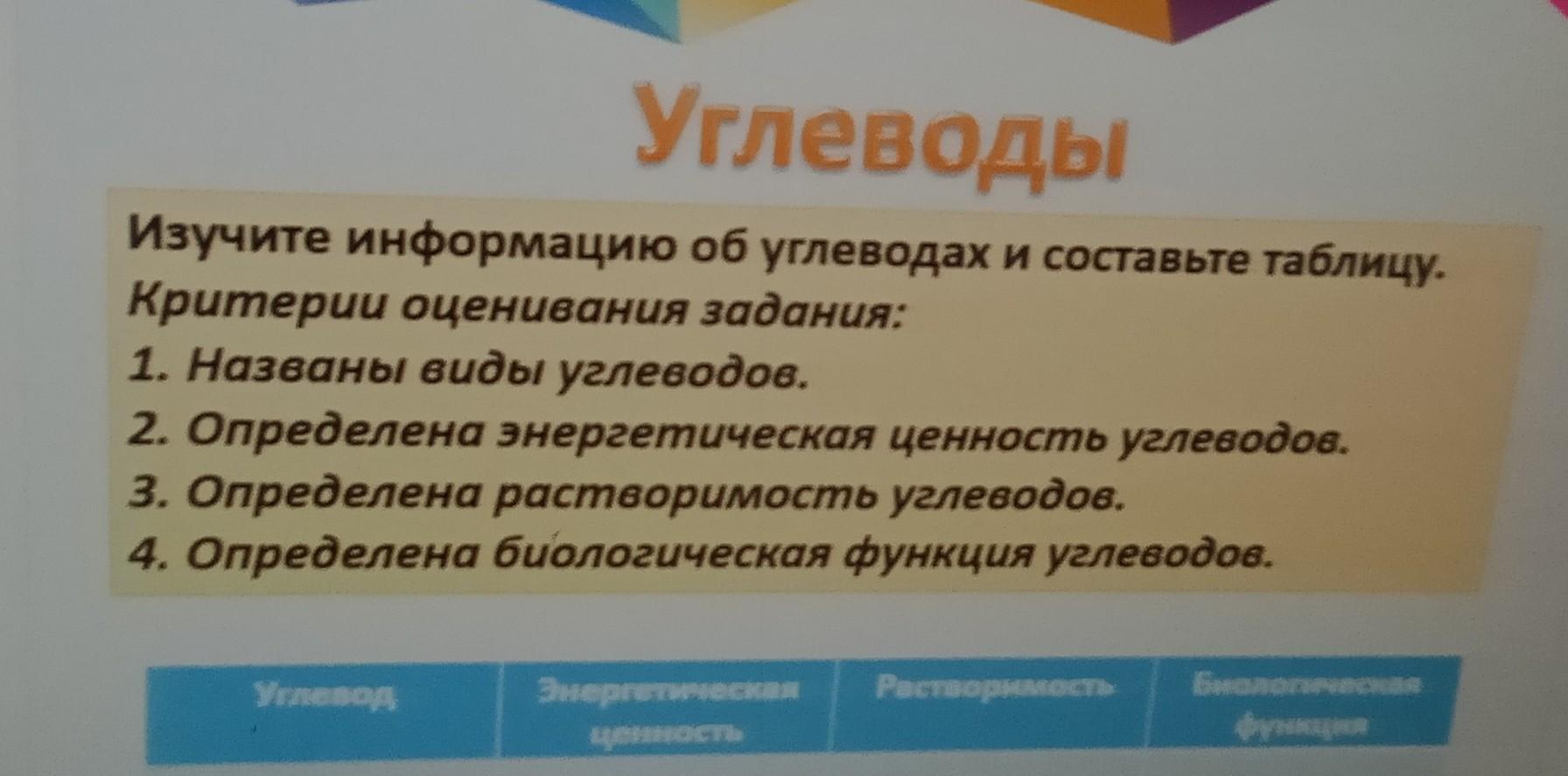 Изучите информацию об углеводах и составьте таблицу. Критерии оценивания задания: 1. Названы виды углеводов. 2. Определена энергетическая ценность углеводов. 3. Определена растворимость углеводов.