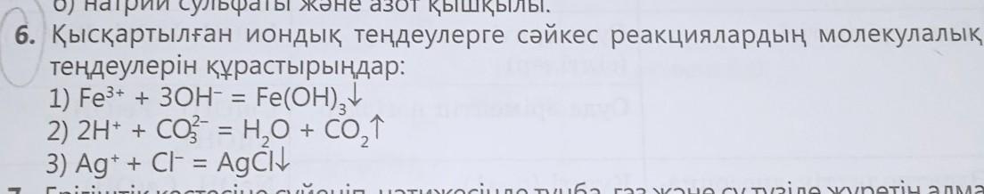 6. Напишите молекулярные уравнения реакций для следующих сокращенных ионных реакций: 1) Fe3+ + 3 OH- = Fe(OH), 2) 2H + CO2- = H,0 + CO,1 3) Ag + Cl = AgCI