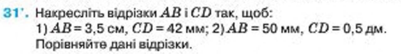 1) AB–3,5 см; CD– 4,2 см. Відрізок CD більший, ніж AB на 0,7 см(7 мм).