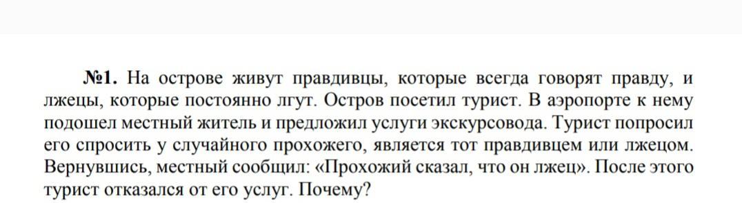 Ответ: Турист отказался, потому что прохожий лжец в любом случае.