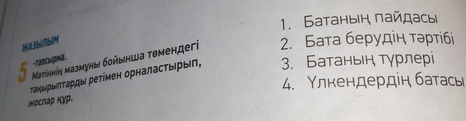 Мәтіннің мазмұны бойынша темендегі тақырыптарды ретімен орналастырып, жоспар құр. 1. 2. Батаның пайдасы Бата берудің тәртібі 3. Батаның түрлері 4. Үлкендердің батасы