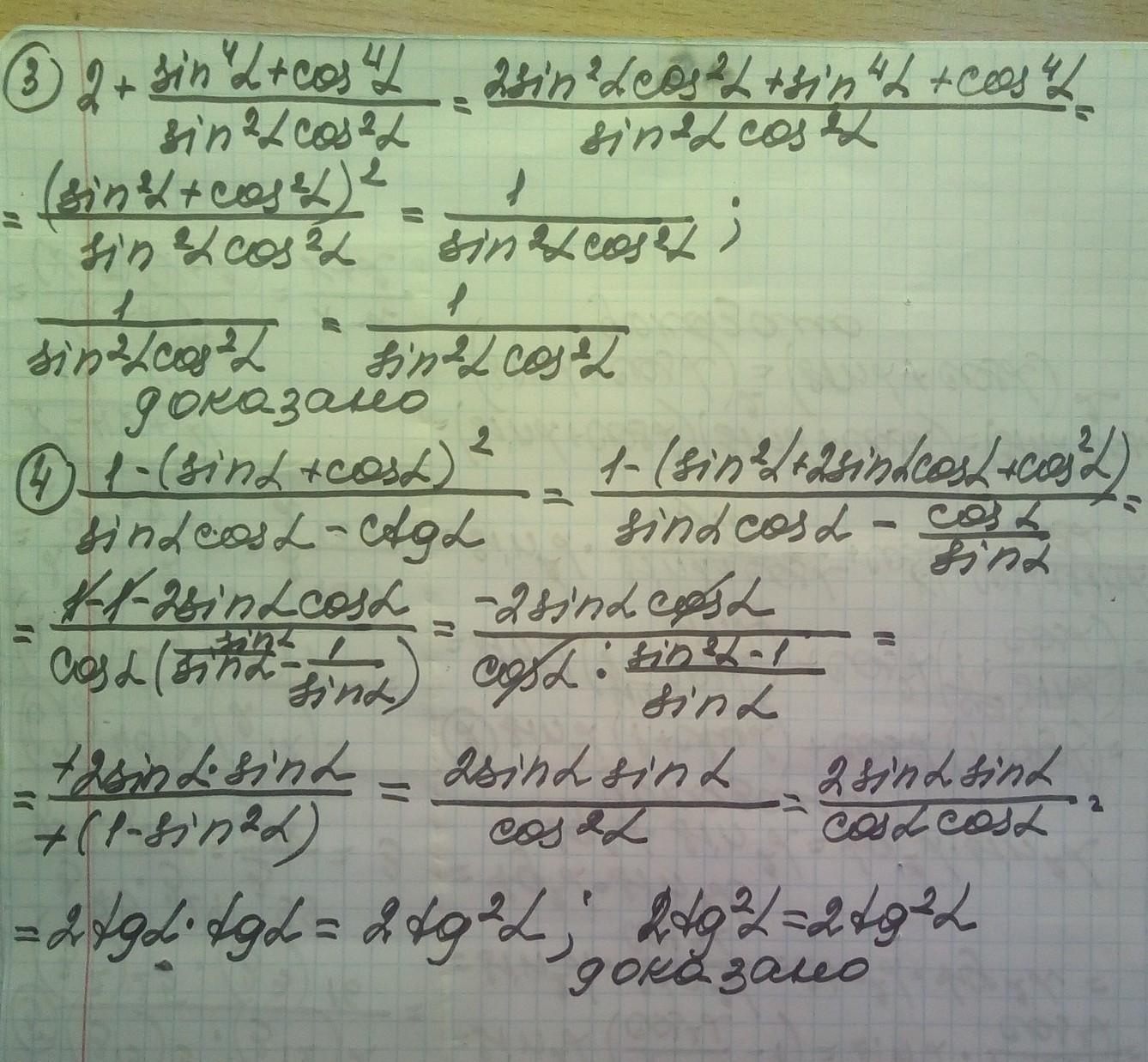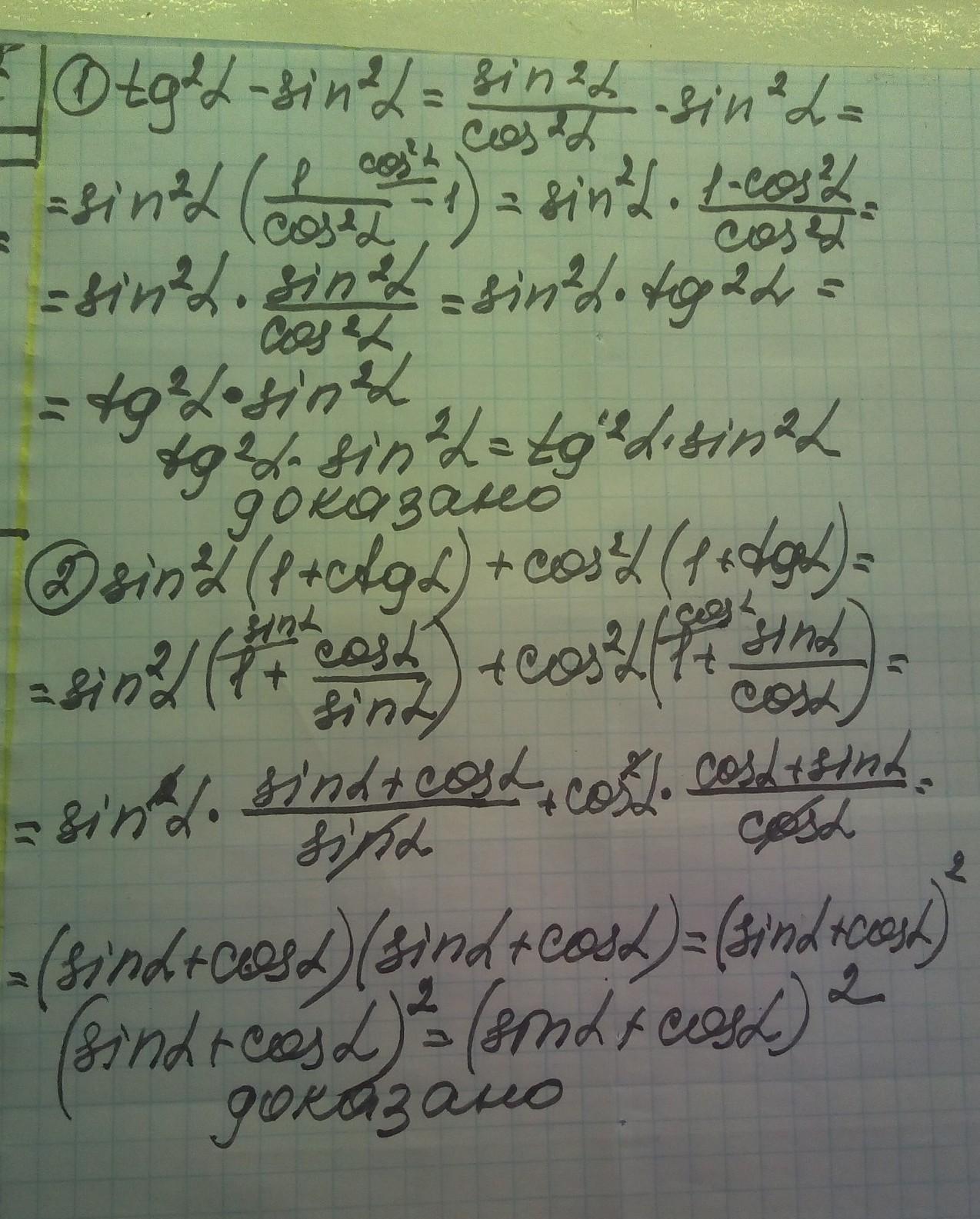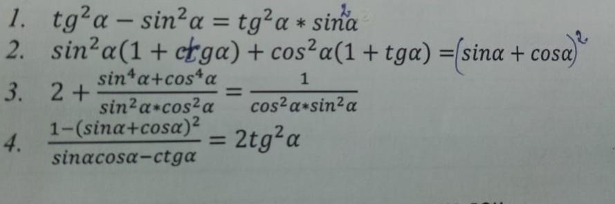 Докажите тождество: 1. tg²a - sin²a = tg²a * sina 2. sin²a(1+crga) + cos²a(1+tga) =(sina + cosa) sin+a+costa 3. sin²a*cos² a 4. 2+ 1-(sina+cosa)² sinacosa-ctga = = 1 cos² a*sin² a 2tg²a