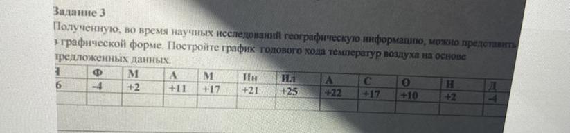 Полученную, во время научных исследований географическую информацию, можно представить в географической форме. Постройте график годового хода температур воздуха на основе