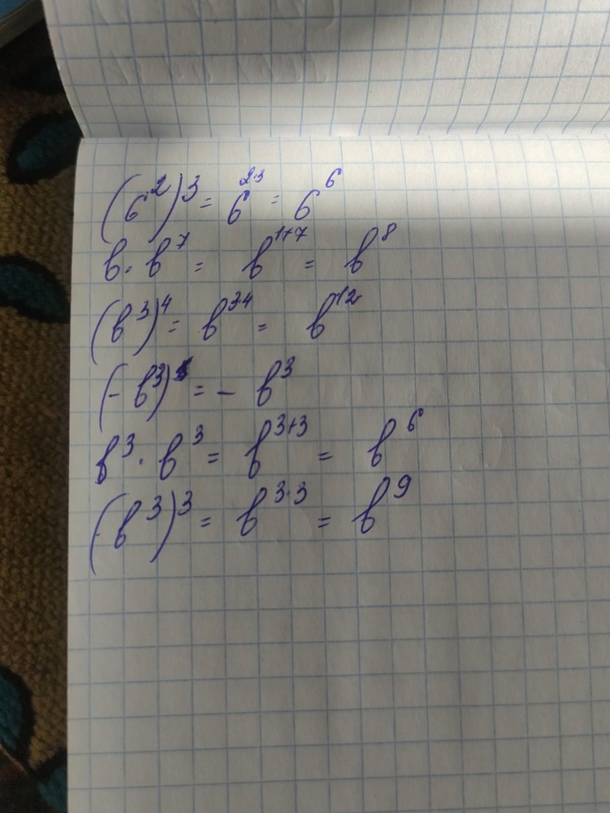 1) (6²)³ ; 2) b•b⁷ ; 3) (b³)⁴; 4) (-b³); 5) b³•b³; 6) (b3)³.