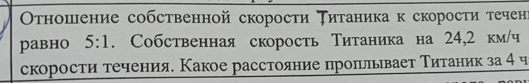Отношение собственной скорости Титаника к скорости течения реки равно 5:1. Собственная скорость Титаника на 24.2 км/ч больше скорости течения. Какое расстояние проплывает Титаник 4 часа ?