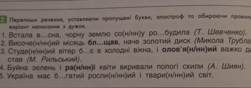 Перепиши речення, устовляючи пропущені букви, апостроф та обираючи правильний 1. Бстала в сна, чорну землю со(H/HH)y po...будила (Т. Шевченко). 2. Височе (н/нний місяць бл...щав, наче золотий диск (Микола 3. Студен нний вітер б. є в холодні вікна, і олов'я(н/нн)ий важко дише Трублаїні), став (М. Рильський). 4. Буйна зелень і ра(н/нн)і квіти вкривали пологi схили (А. Шиян). 5. Україна має б.гатий росли н/нн)ий і твари(н/нн)ий світ.