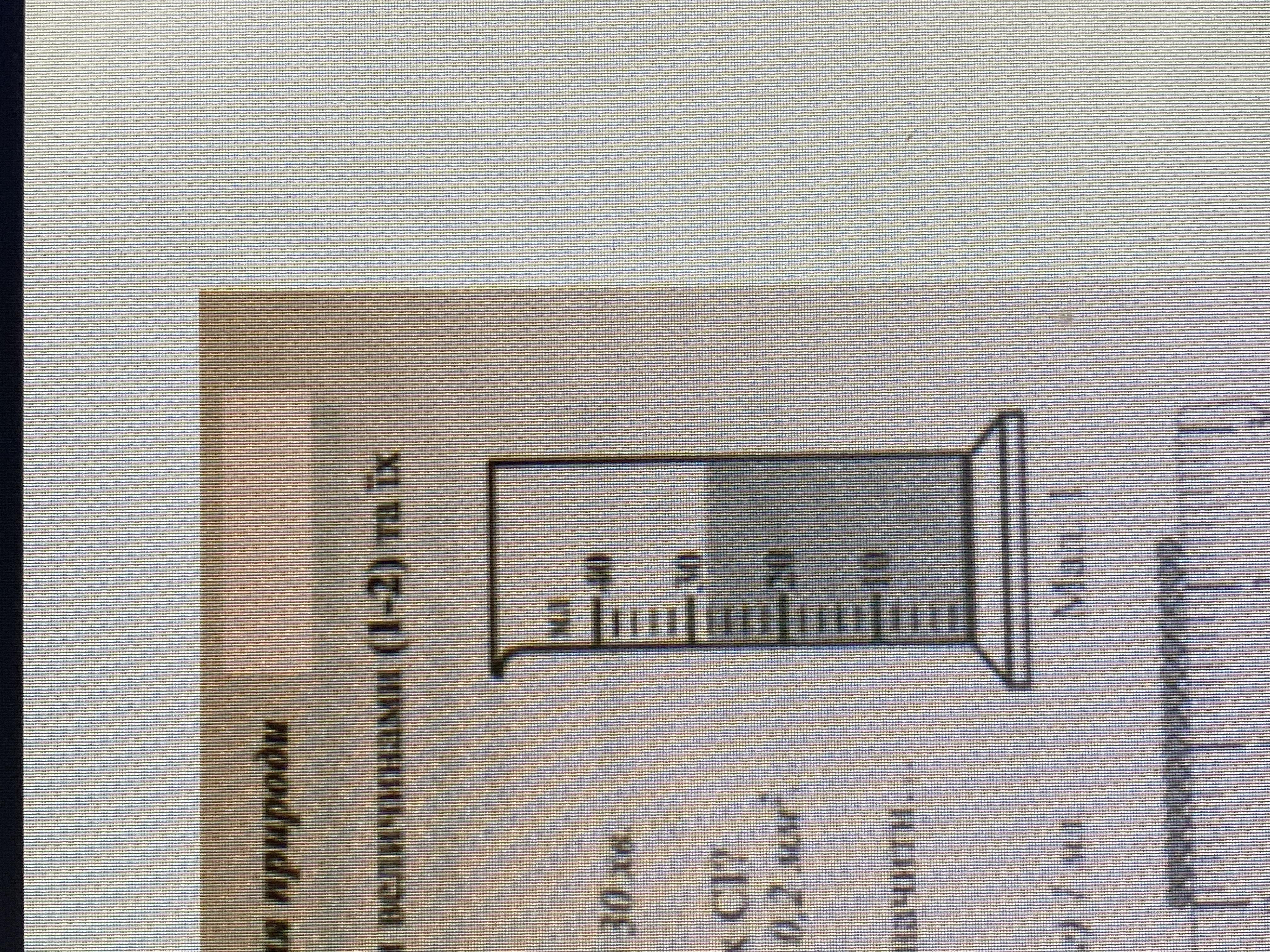 На малюнку зображено мензурку визначити її ціну поділки шкали мензурки і об’єм води у мензурці