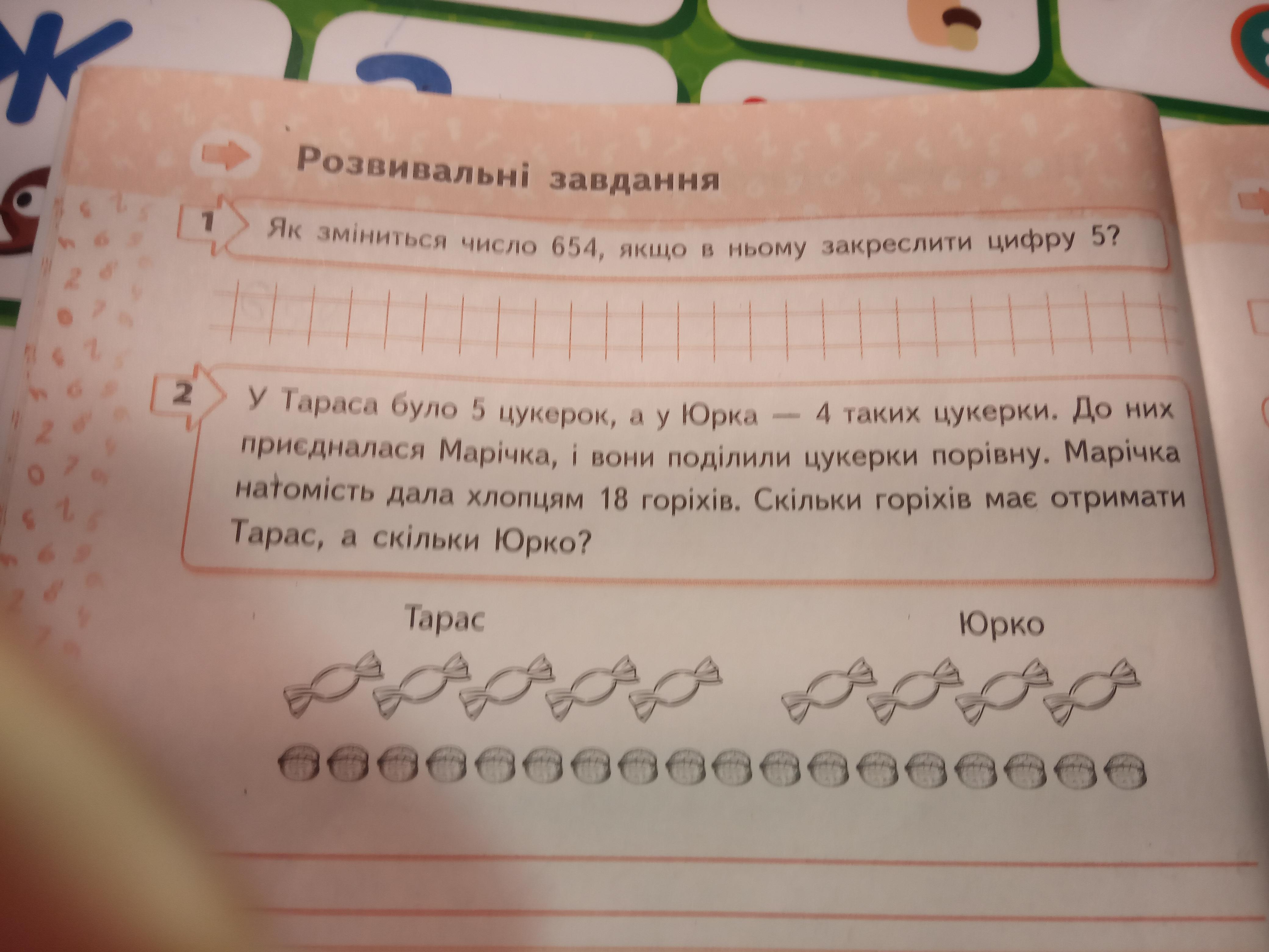 1) 5 + 4 = 9(цукерок) - мають Тарас та Юрко разом цукерок