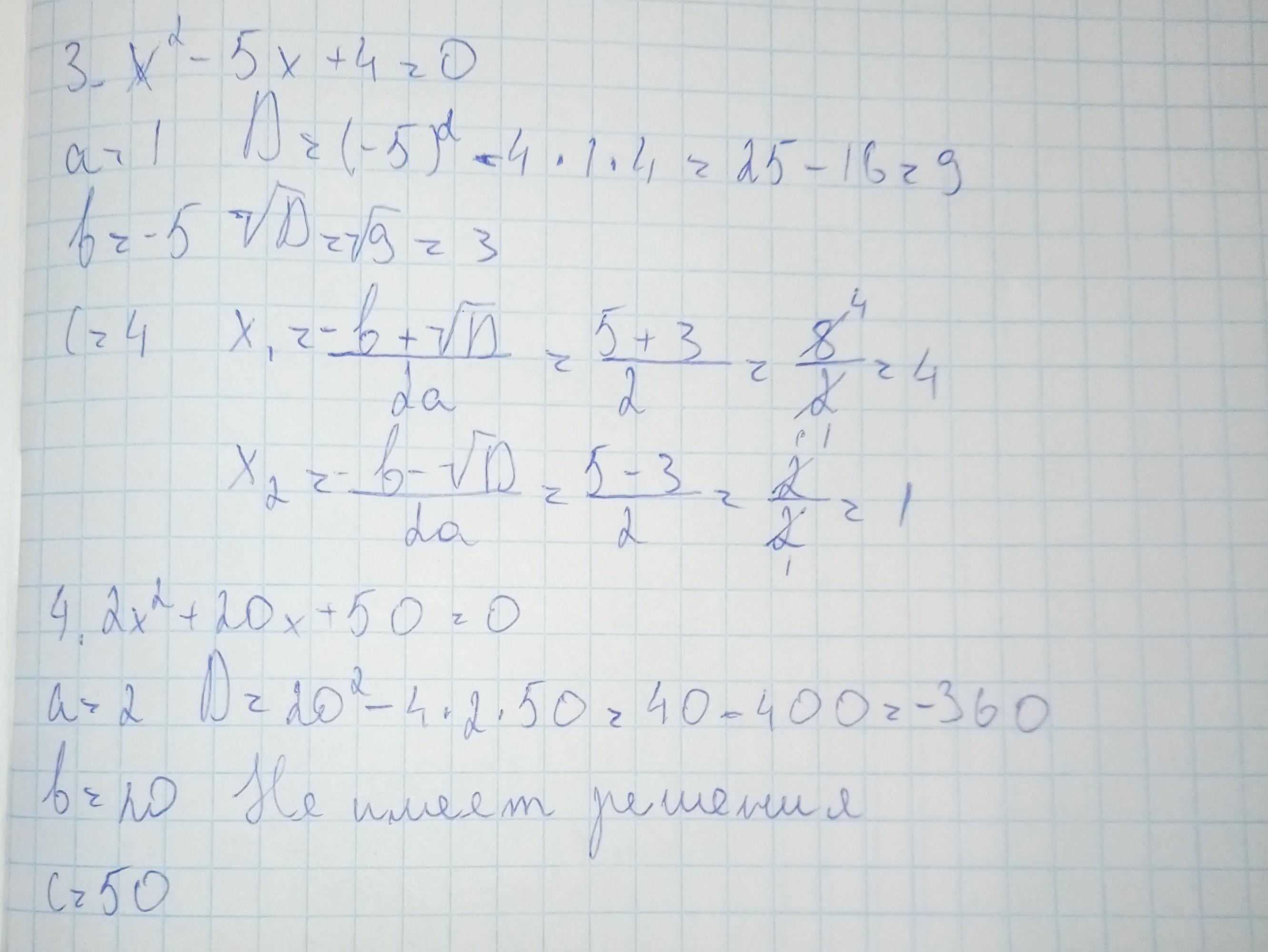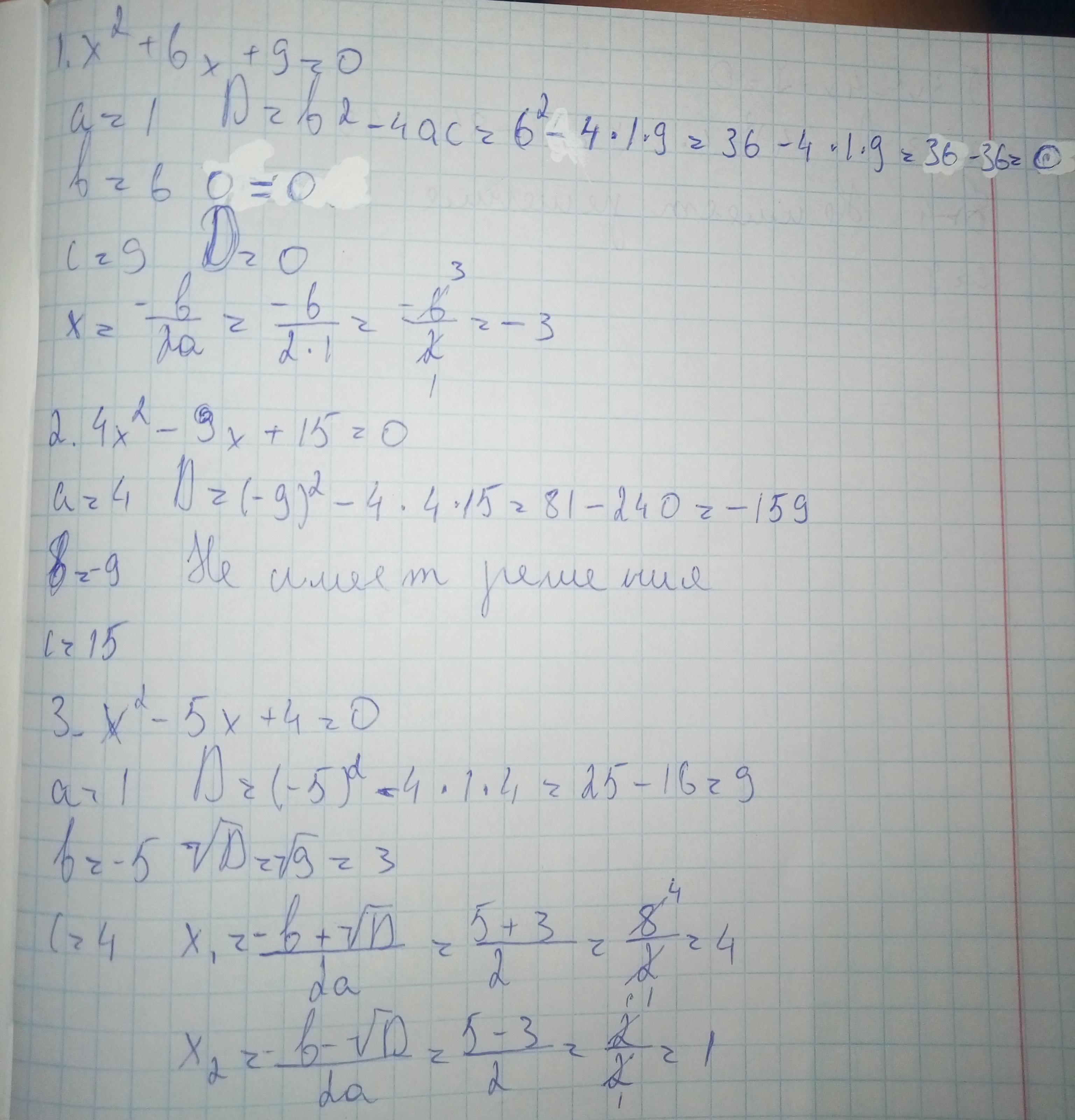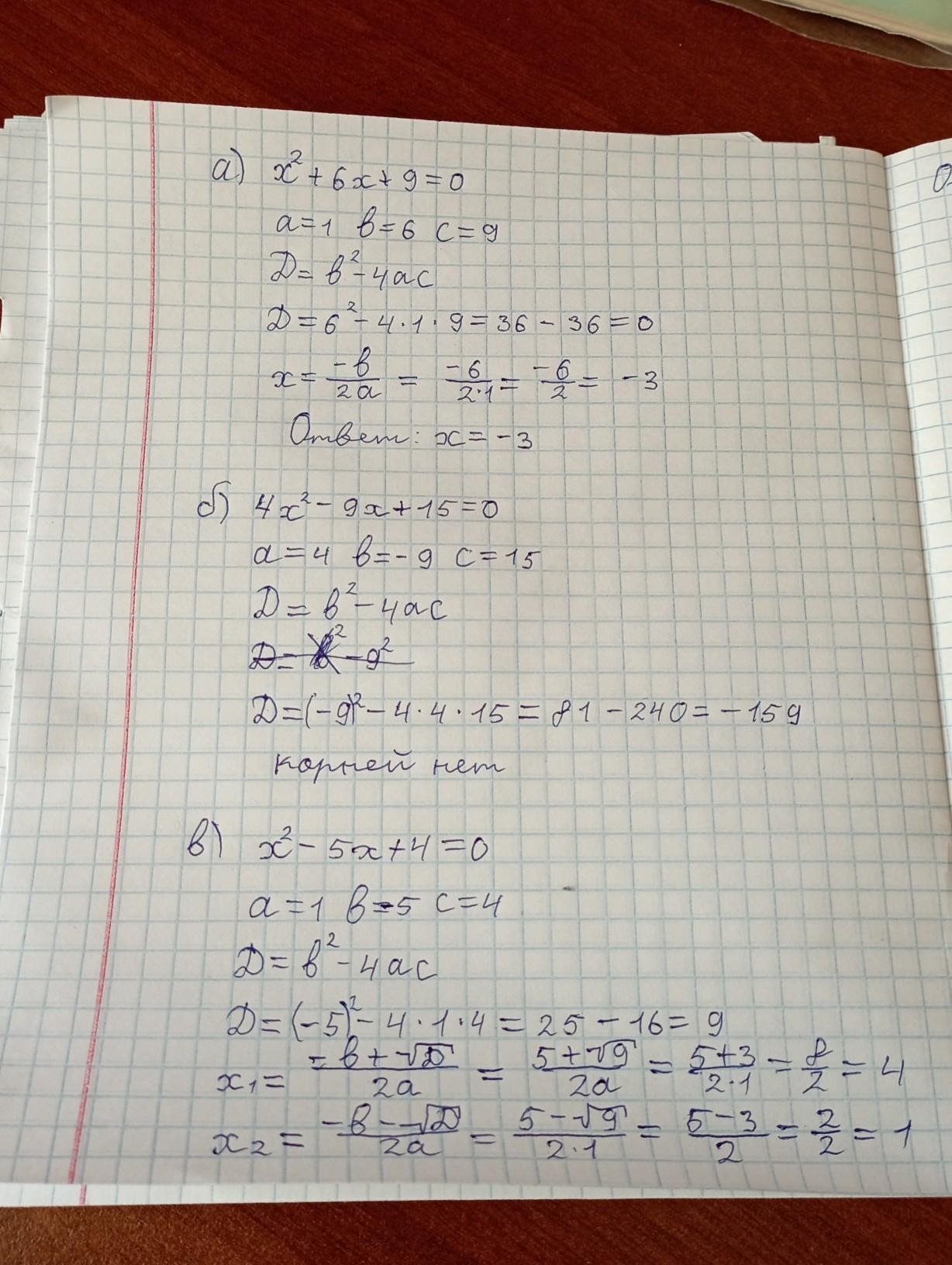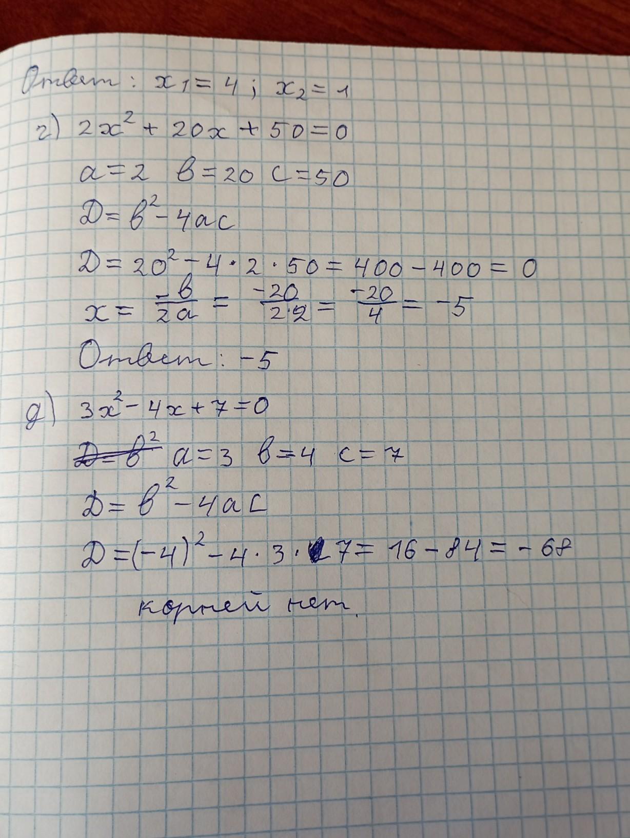 а) х²+6х+9=0 ; б) 4х²-9х+15=0 ; в) х²-5х+4=0 ; г) 2х²+20х+50=0 ; д) 3х²-4х+7=0 пожалуйста помогите мне срочно нужно