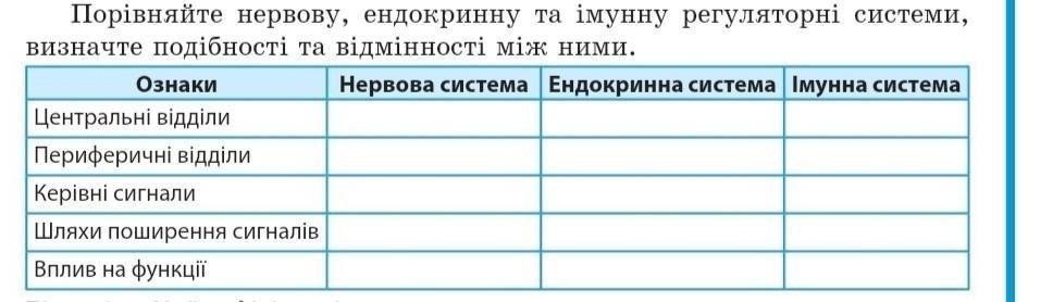 Порівняйте нервову, ендокринну та імунну регуляторні системи, визначте подiбності та відмінності між ними. Нервова система Ендокринна система Iмунна система Ознаки Центральні відділи Периферичні відділи Керівні сигнали Шляхи поширення сигналів Вплив на функції