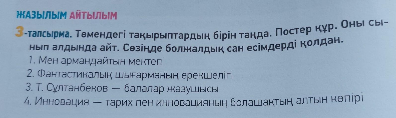 ЖАЗЫЛЫМ АЙТЫЛЫМ 3-тапсырма. Төмендегі тақырыптардың бірін таңда. Постер құр. Оны сы- нып алдында айт. Сөзіңде болжалдық сан есімдерді қолдан. 1. Мен армандайтын мектеп 2. Фантастикалық шығарманың ерекшелігі балалар жазушысы 3. Т. Султанбеков 4. Инновация — тарих пен инновацияның болашақтың алтын көпірі