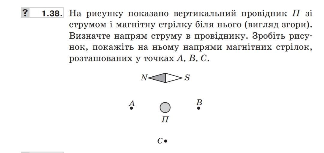 На рисунку показано вертикальний провідник П зі струмом і магнітну стрілку біля нього (вигляд згори). Визначте напрям струму в провіднику. Зробіть рису нок, покажiть на ньому напрями магнітних стрілок, розташованих у точках А, B, C. Даю 100 болів !!!!!