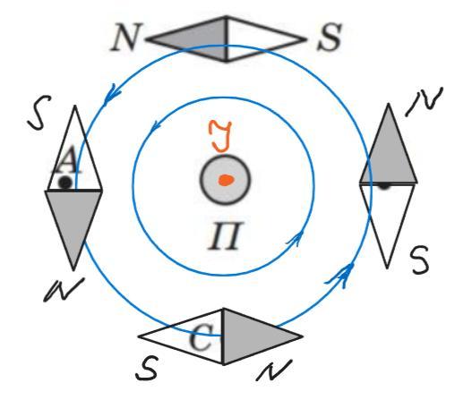Пояснення: Магнітні лінії прямого провідника зі струмом - концентричні кола. Їх напрям вказує північний (N) полюс верхньої стрілки (проти руху годинної стрілки). Тоді магнітні стрілки в точках А, В, С, встановляться так, що їх осі співпадають з дотичними в цих точках, а північні (N) полюси встановляться в напрямку магнітних ліній.