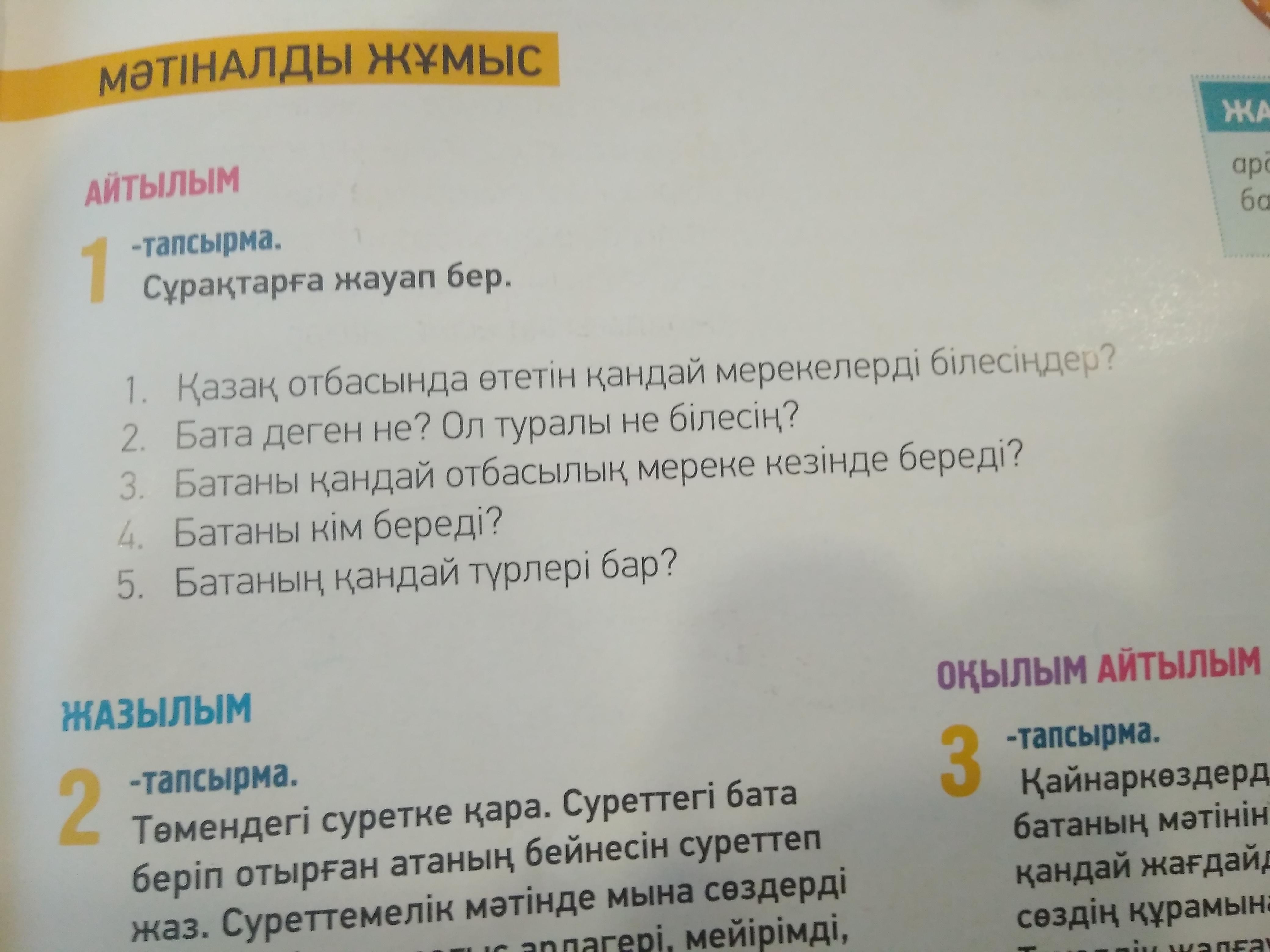 2)Бата деген ол мерекелерде немесе тойларда,дастарқан үстінде үйдің үлкені не немесе ата әжеміз айтатын кішігірім тілек.