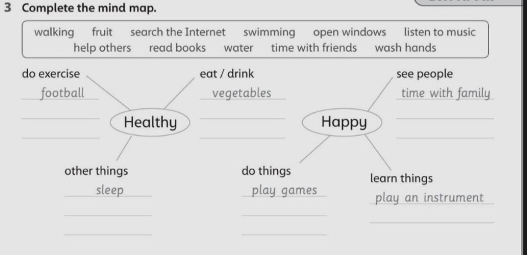 3 Complete the mind map. walking fruit search the Internet help others read books do exercise football Healthy other things sleep swimming open windows water time with friends wash hands eat / drink vegetables do things play games Lesson Six Happy listen to music see people time with family learn things play an instrument