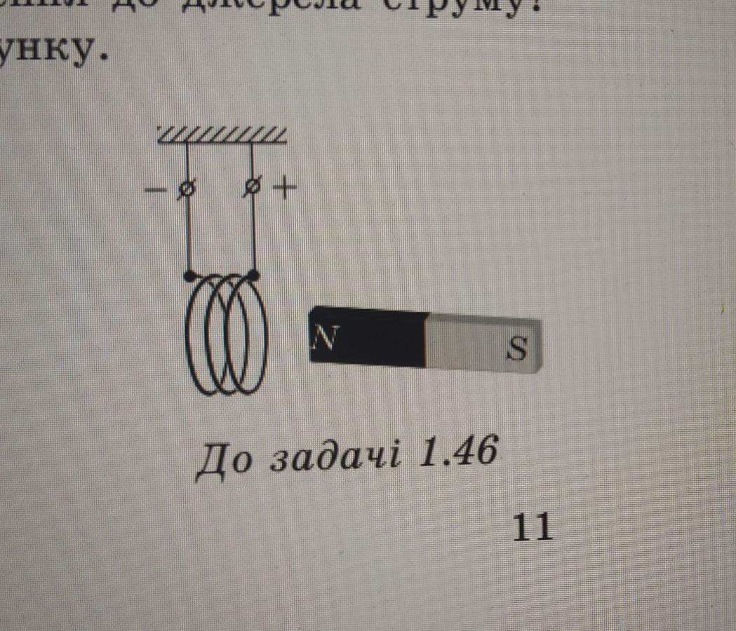 Пояснення: після підключення до джерела струму у котушці виникає струм, навколо неї з'являється магнітне поле. Визначивши напрям струму у витках та скориставшись правилом правої руки бачимо, що на правому боці котушки, який ближче до північного (N) полюсу магніту знаходиться північний полюс. Однойменні полюси відштовхуються, а тому котушка, яка підвішена на гнучких дротах, відхилиться вліво, а оскільки вона може обертатися навколо вертикальної осі, то вона розвернеться на 180⁰ і вже південний (S) полюс котушки буде ближче до північного полюса магніту. Різнойменні полюси притягуються, тому котушка притягнеться до магніту.