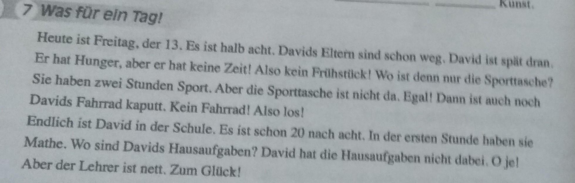 Gestern war Freitag, der 13. Es war halb acht. Davids Eltern waren schon weg.David war spät dran. Er hatte Hunger, aber er hatte keine Zeit! Also kein Frühstück! Wo war denn nur die Sporttasche? Sie hatten ywei Stunden Sport. Aber die Sporttasche war nicht da. Egal! Dann war auch noch Davids Fahrrad kaputt. Kein Fahhrd! Also loste!