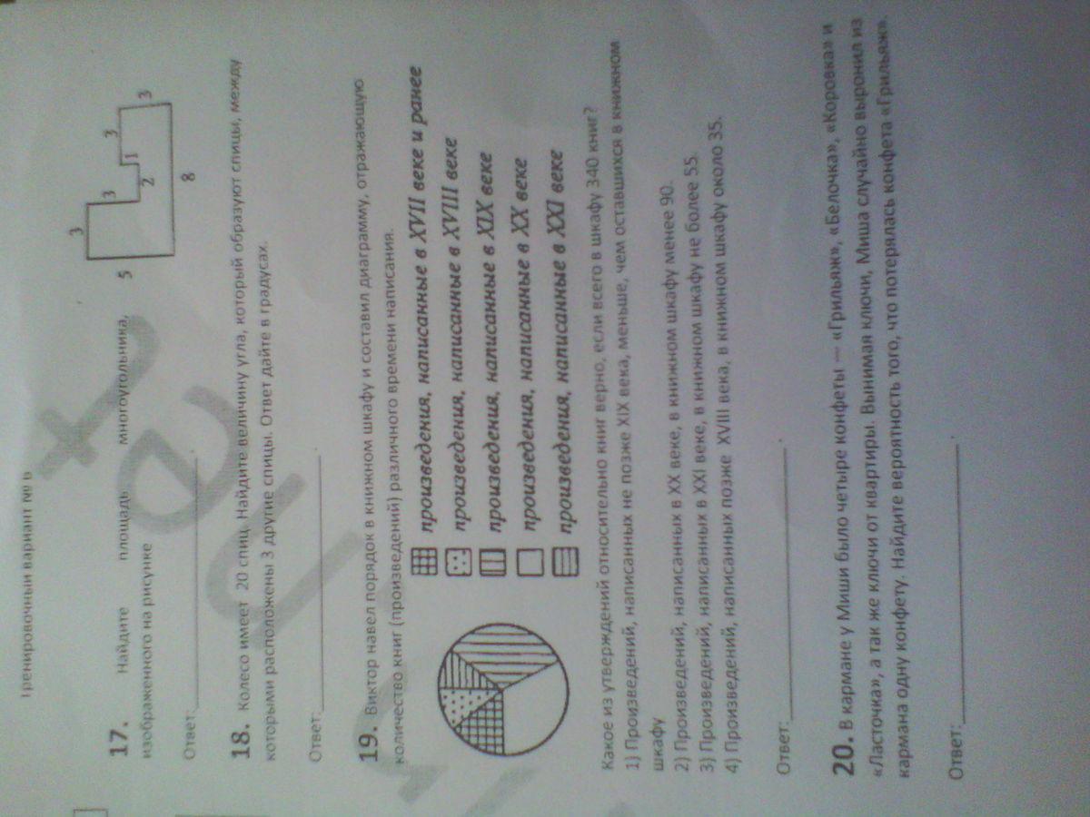 18. полный угол = 360 градусов, т.к. 20 спиц, то между 2 соседними спицами будет угол 360/20=18 градусов. Рассматривая спицы, между которыми еще 3 спицы, получаем всего 4 угла => угол между спицами, между которыми еще 3 спицы будет составлять 18*4=64 градуса