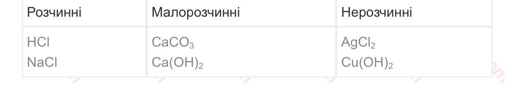 наведіть по два приклади розчинних, малорозчинних і практично нерозчінних у воді речовин-представників різних неорганічних сполук