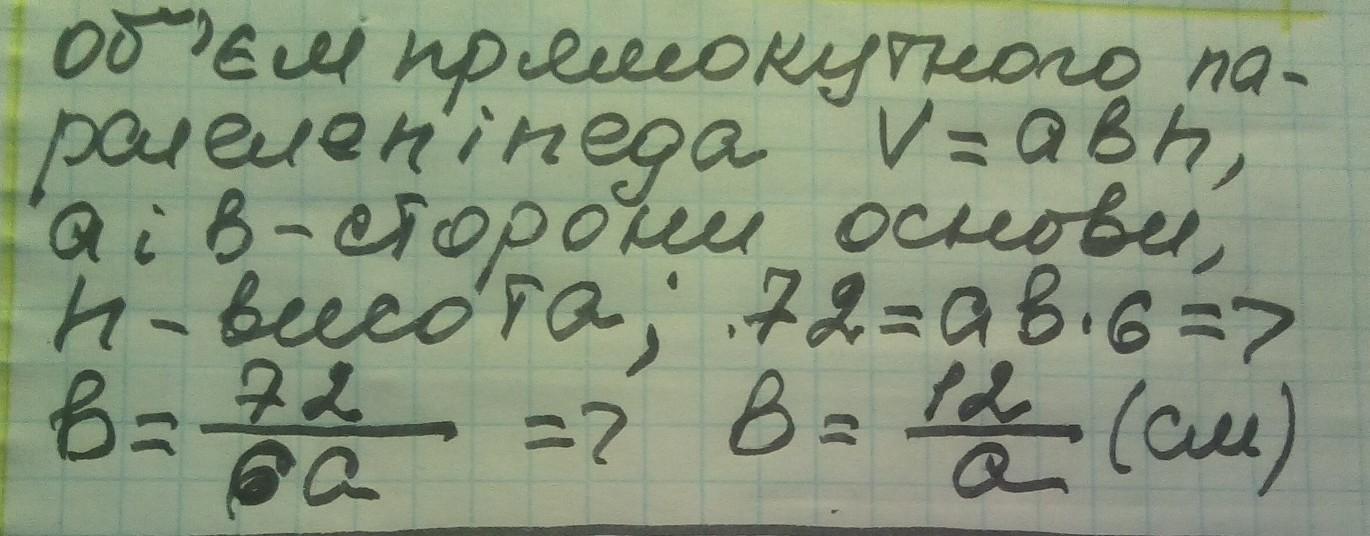 Прямоугольный параллелепипед со сторонами основания a см, b см, и высотой 6 см имеет объем, равный 72 см³. Выразите формулой зависимость b от a.