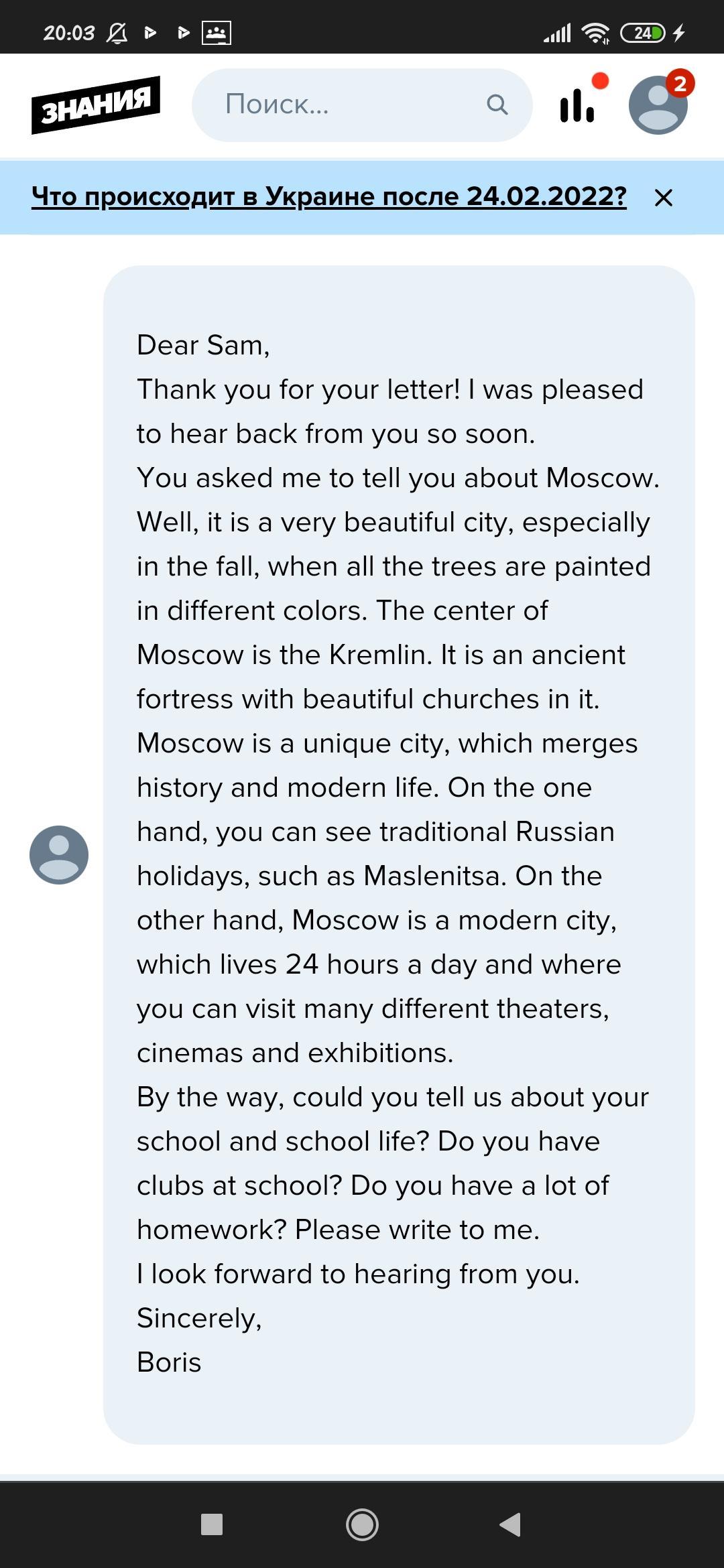 Кстати, ты можешь мне рассказать о своей школе и школьной жизни? Есть ли у вас клубы в школе? Много вам задают домашних заданий? Пожалуйста, напиши мне.