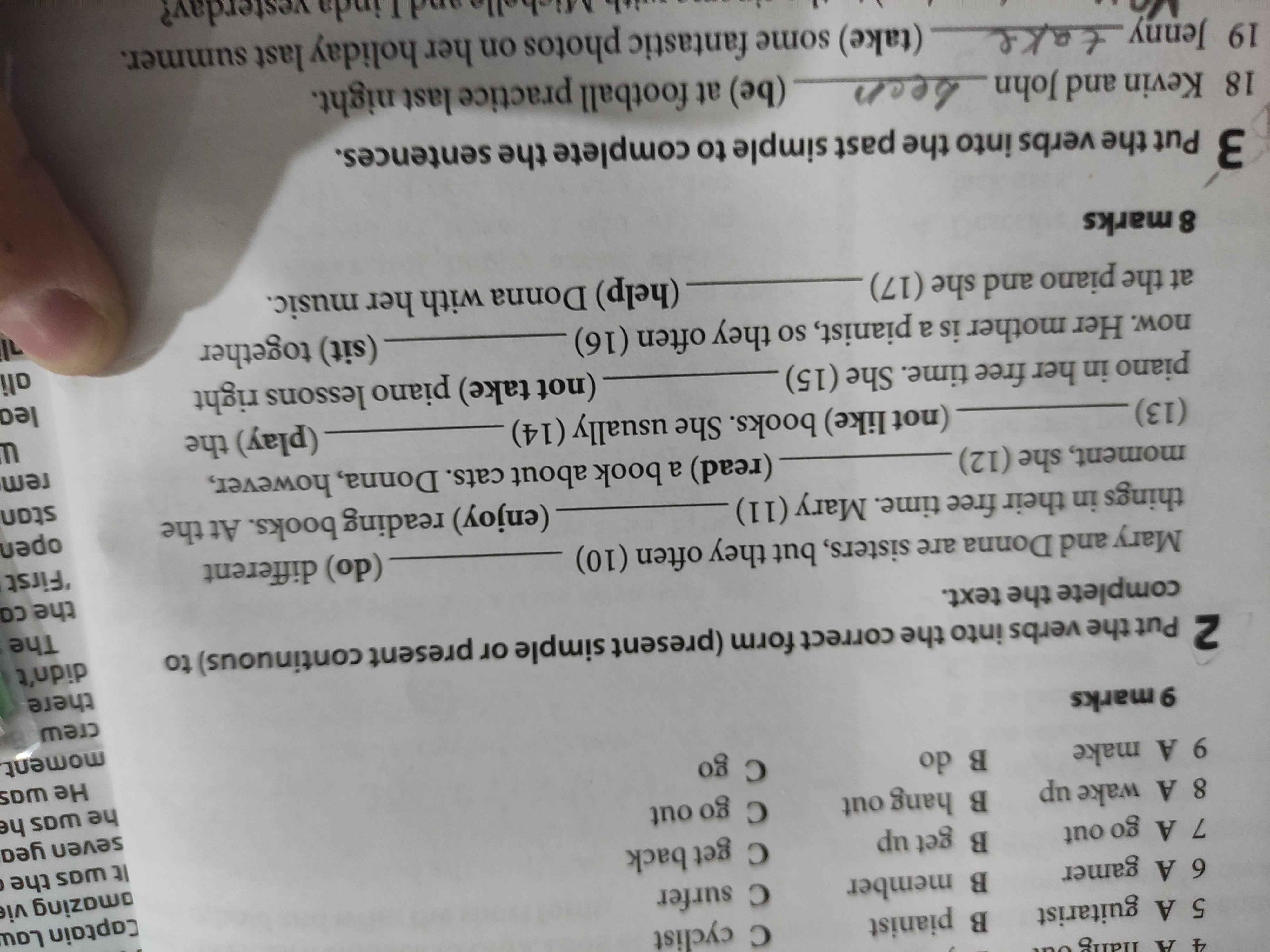 10. do 11. enjoys 12. is reading 13. doesn't like 14. plays 15. isn't taking 16. sit 17. helps