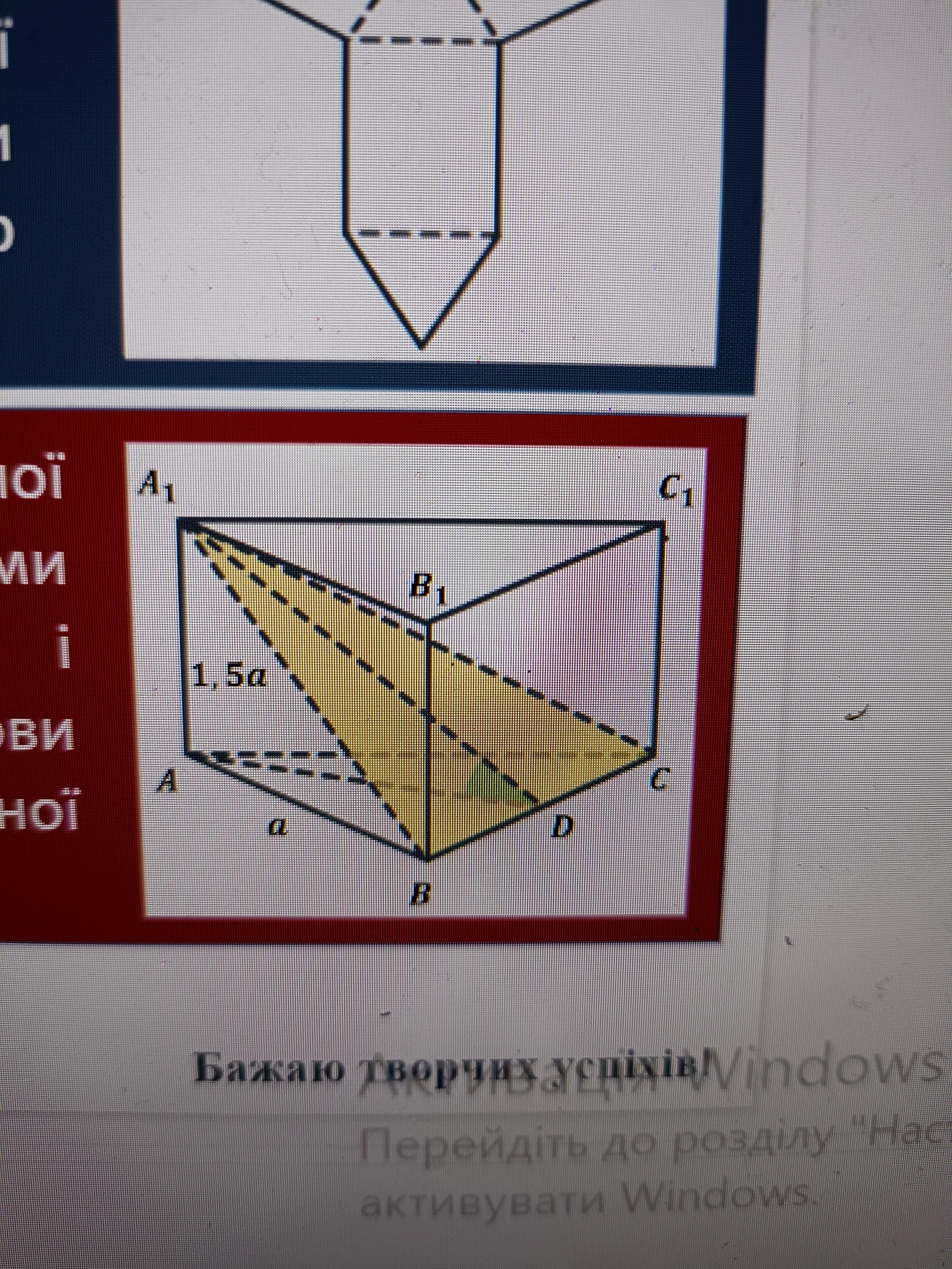 Сторона основи правильної трикутної призми дорівнює а, висота призми дорівнює 1,5а. Через сторону основи і протилежну вершину іншої основи побудовано переріз. Знайдіть площу бічної поверхні призми та висоту основи призми.