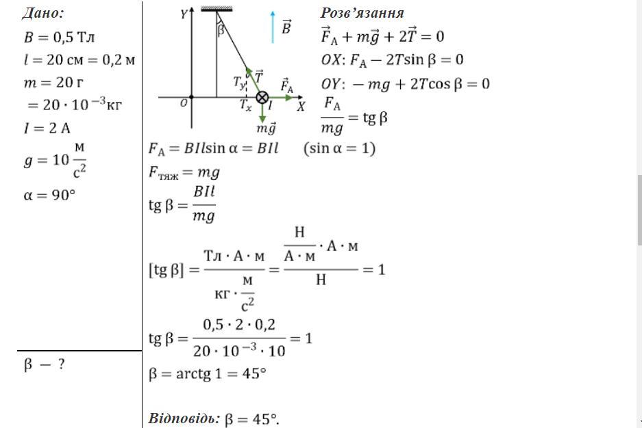 У вертикальному однорідному магнітному полі з індукцією 0,5 Тл на двох тонких нитках горизонтально підвісили провідник, довжина якого 20 см, а маса 20 г. На який кут від вертикалі відхиляться нитки, якщо сила струму в провіднику становить 2 А?
