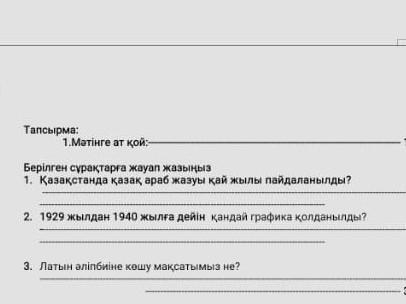 Тапсырма: 1.Мәтінге ат қой:------------------------------------------------------------------------------------ 1б Берілген сұрақтарға жауап жазыңыз 1. Қазақстанда қазақ араб жазуы қай жылы пайдаланылды? --------------------------------------------------------------------------------------------------------------------------------------------------------------------------------------------------------------------------- 2. 1929 жылдан 1940 жылға дейін қандай графика қолданылды? ---------------------------------------------------------------------------------------------------------------------------------------------------------------------------------------------------------------------------- 3. Латын әліпбиіне көшу мақсатымыз не? ------------------------------------------------------------------------------------------------------------------------------------------------------------------------