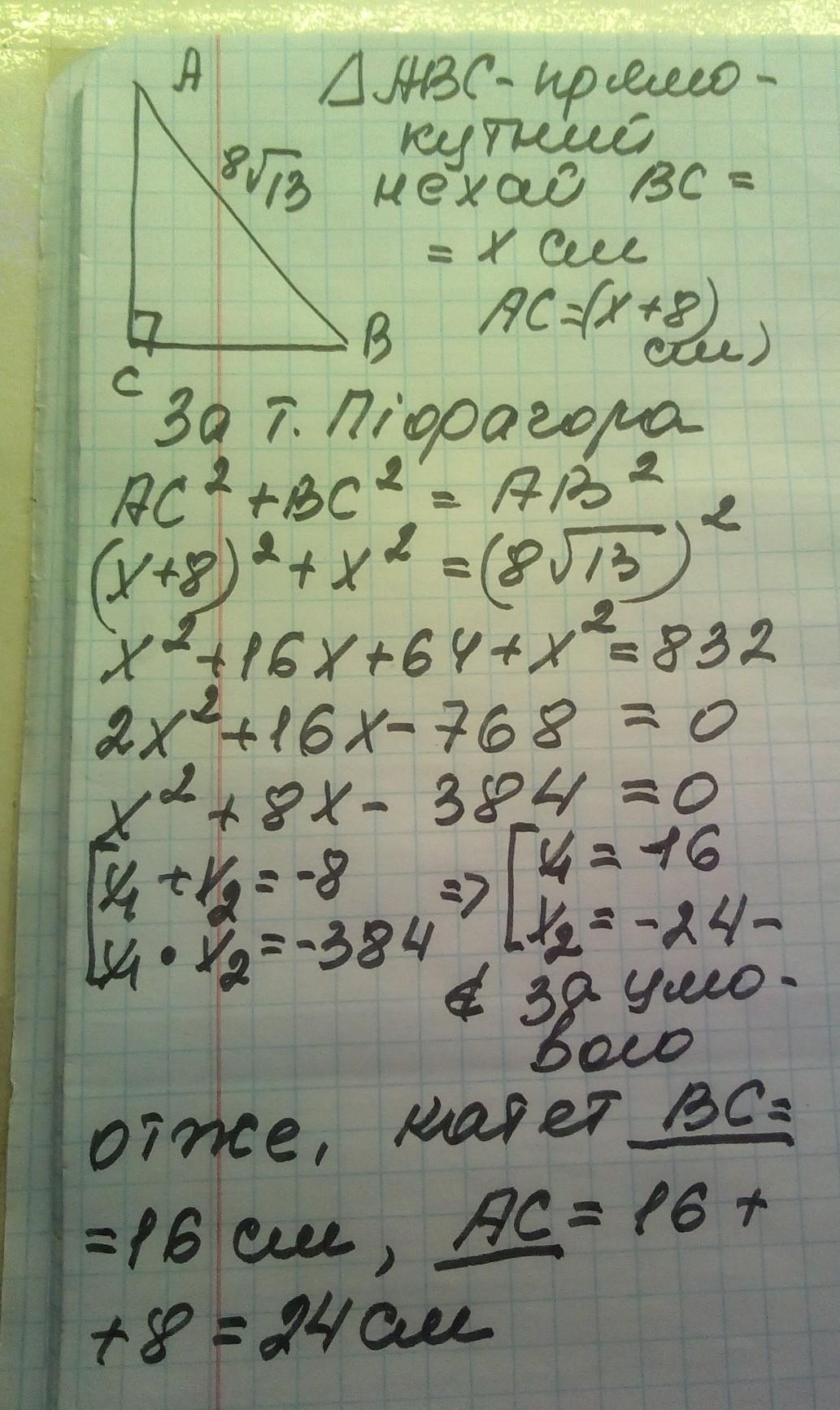 Один из катетов прямоугольного треугольника на 8 см больше другого, а гипотенуза равна 8√13 см. Найдите катеты этого треугольника.