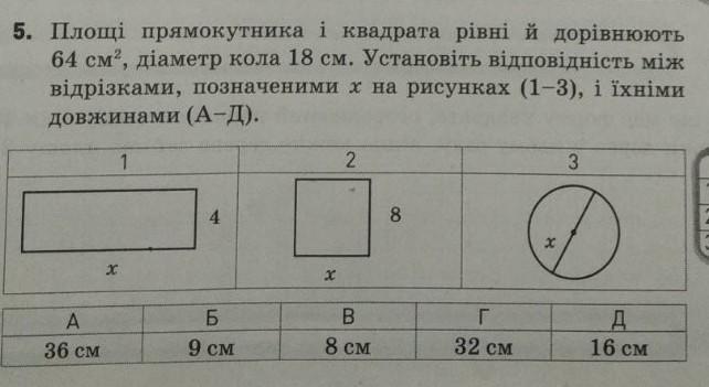 A 36 cм Х 1 4 Б 9 cм x 2 В 8 см 8 Г 32 см X 3 Д 16 сскажіть відповить як там б-34 и т.д. на кожен вираз