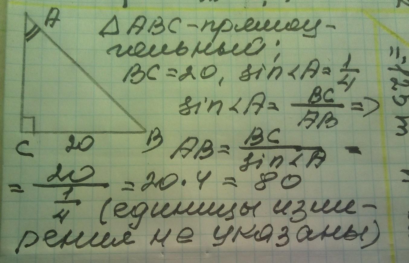 !ПОМОГИТЕ ПОЖАЛУЙСТА! Найдите длину гипотенузы прямоугольного треугольника, если один из его катетов равен 20, а синус угла противоположного этому катету равен 1/4