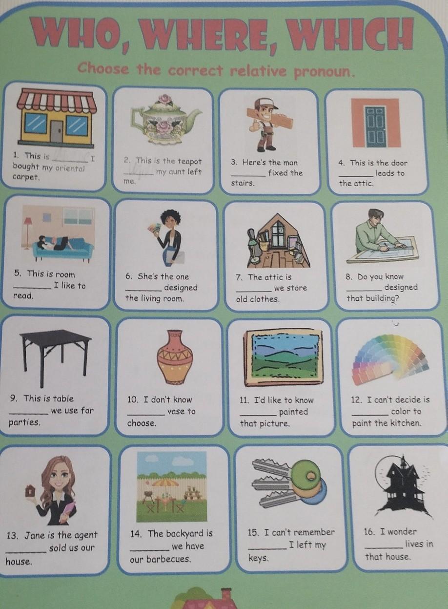 WHO, WHERE, WHICH Choose the correct relative pronoun. 1. This is bought my oriental carpet. 5. This is room read. 9. This is table parties. I like to house. I we ve use for 13. Jane is the agent sold us our 2. This is the teapot D my aunt left me. 6. She's the one designed the living room. 10. I don't know vase to choose. 14. The backyard is we have our barbecues. 3. Here's the man fixed the stairs. 7. The attic is we store old clothes. 11. I'd like to know painted that picture. $9 15. I can't remember I left my keys. 4. This is the door leads to the attic. 8. Do you know designed that building? 12. I can't decide is color to paint the kitchen. 16. I wonder W lives in that house.