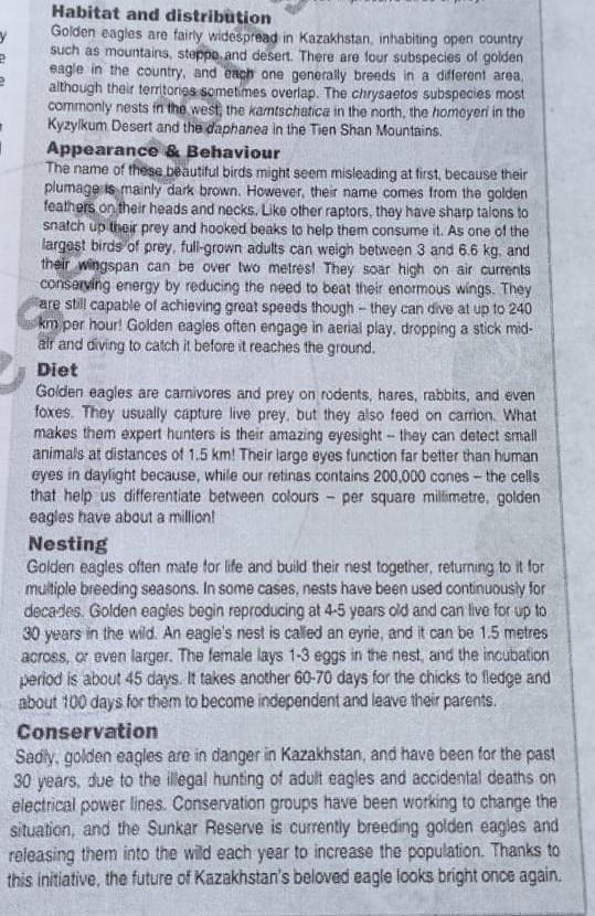 2 at these impressive birds of prey. Habitat and distribution Golden eagles are fairly widespread in Kazakhstan, inhabiting open country such as mountains, steppo. and desert. There are four subspecies of golden eagle in the country, and each one generally breeds in a different area. although their territories sometimes overlap. The chrysaetos subspecies most commonly nests in the west, the kamtschatica in the north, the homoyeri in the Kyzylkum Desert and the daphanea in the Tien Shan Mountains. Appearance & Behaviour The name of these beautiful birds might seem misleading at first, because their plumage is mainly dark brown. However, their name comes from the golden feathers on their heads and necks. Like other raptors, they have sharp talons to snatch up their prey and hooked beaks to help them consume it. As one of the largest birds of prey, full-grown adults can weigh between 3 and 6.6 kg, and their wingspan can be over two metres! They soar high on air currents conserving energy by reducing the need to beat their enormous wings. They are still capable of achieving great speeds though they can dive at up to 240 km per hour! Golden eagles often engage in aerial play, dropping a stick mid- air and diving to catch it before it reaches the ground. A Diet Golden eagles are carnivores and prey on rodents, hares, rabbits, and even foxes. They usually capture live prey, but they also feed on carrion. What makes them expert hunters is their amazing eyesight - they can detect small animals at distances of 1.5 km! Their large eyes function far better than human eyes in daylight because, while our retinas contains 200,000 cones-the cells that help us differentiate between colours per square millimetre, golden eagles have about a million! Nesting Golden eagles often mate for life and build their nest together, returning to it for multiple breeding seasons. In some cases, nests have been used continuously for decades. Golden eagles begin reproducing at 4-5 years old and can live for up to 30 years in the wild. An eagle's nest is called an eyrie, and it can be 1.5 metres across, or even larger. The female lays 1-3 eggs in the nest, and the incubation period is about 45 days. It takes another 60-70 days for the chicks to fledge and about 100 days for them to become independent and leave their parents. Conservation Sadly, golden eagles are in danger in Kazakhstan, and have been for the past 30 years, due to the illegal hunting of adult eagles and accidental deaths on electrical power lines. Conservation groups have been working to change the situation, and the Sunkar Reserve is currently breeding golden eagles and releasing them into the wild each year to increase the population. Thanks to this initiative, the future of Kazakhstan's beloved eagle looks bright once again.