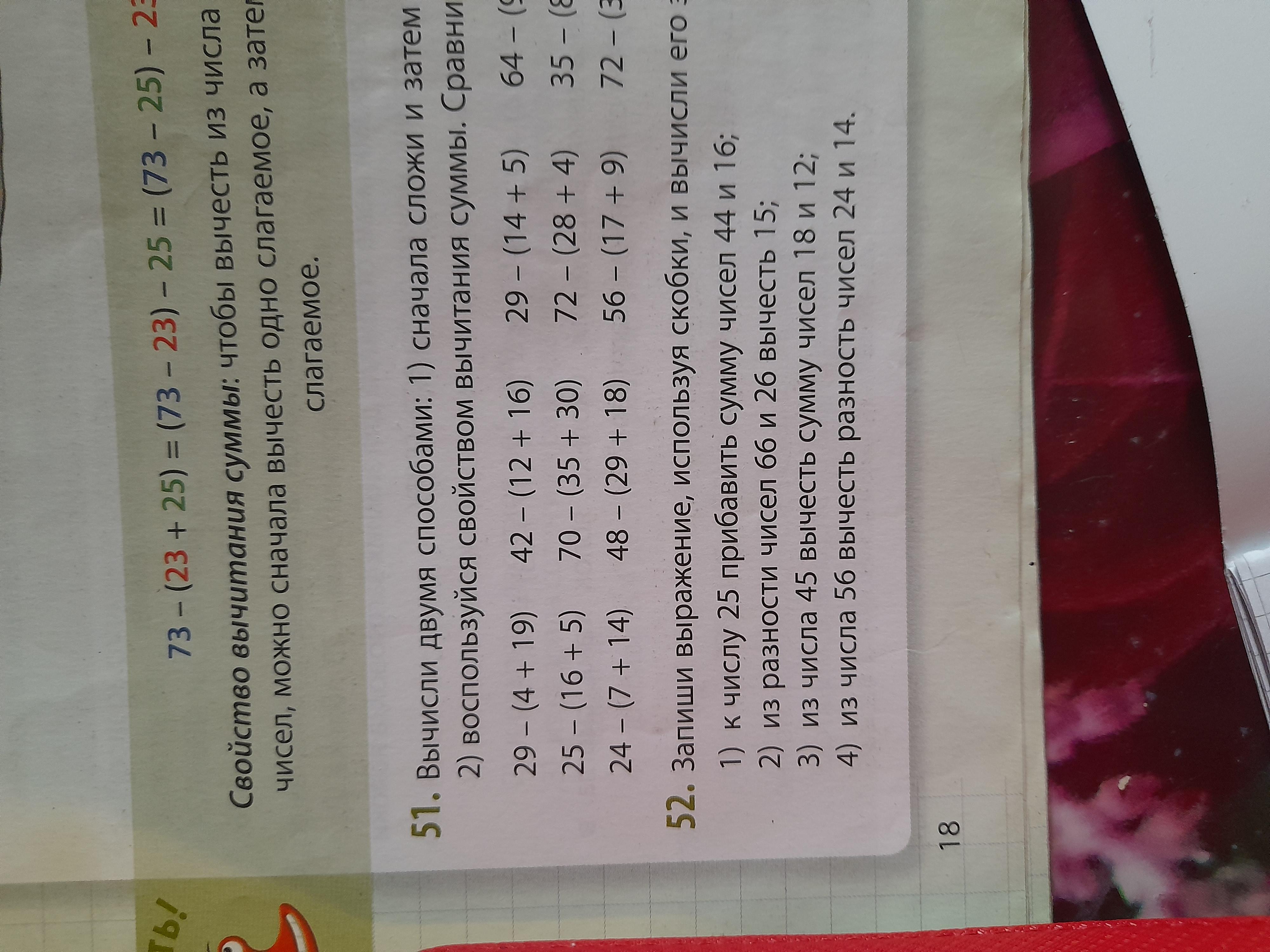 Запиши выражение, используя скобки и вычисли его значение задание номер 52 3,4 строка.
