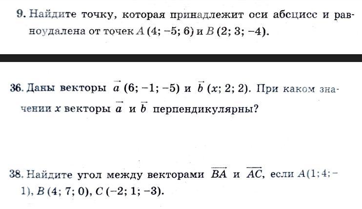 9. Найдите точку, которая принадлежит оси абсцисс и равноудалена от точек А(4; -5; 6) и В(2; 3; -4).