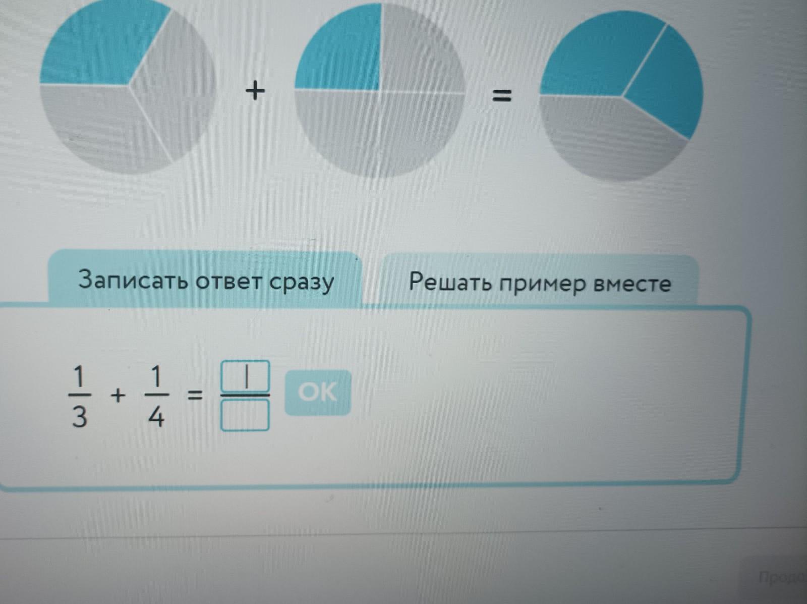 Шукаємо найменший спільний знаменник, тобто 12. Домножуємо 1·4 і 1·3. Виходить 4+3/12. Обчислюємо