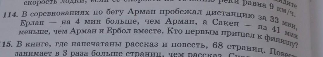 км/ч. 114. В соревнованиях по бегу Арман пробежал дистанцию за 33 мин. на 41 мин на 4 мин больше, чем Арман, а Сакен Ерлан меньше, чем Арман и Ербол вместе. Кто первым пришел к финишу? 115 В книго nro OTTOTomorr