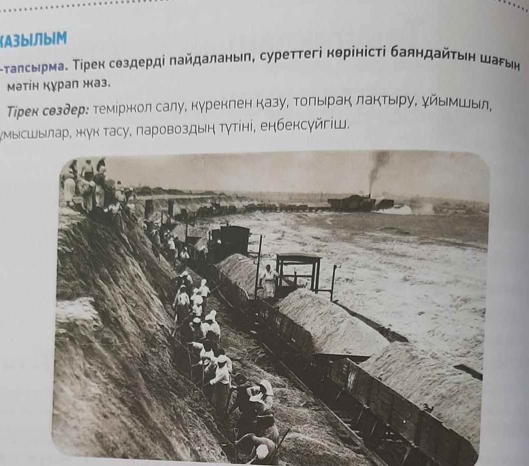 4-тапсырма. Тірек сөздерді пайдаланып, суреттегі көріністі баяндайтын шағын мәтін құрап жаз. Тірек сөздер: теміржол салу, күрекпен қазу, топырақ лақтыру, ұйымшыл, жұмысшылар, жүк тасу, паровоздың түтіні, еңбексүйгіш.