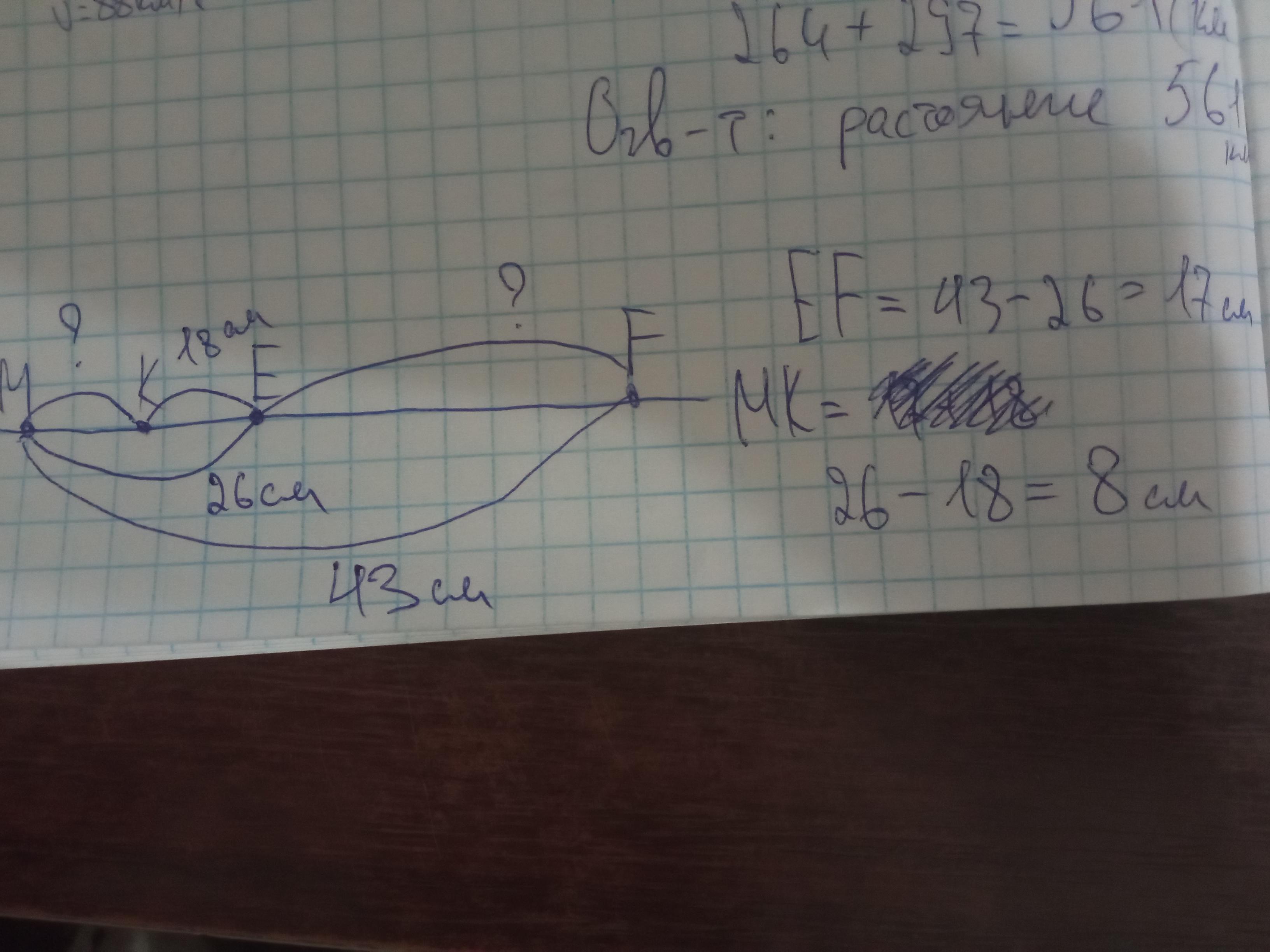 Відомо, що MF = 43 см, ME = 26 см, KE = 18 см. Знайдіть довжини відрізків MK i EF ответь быстро