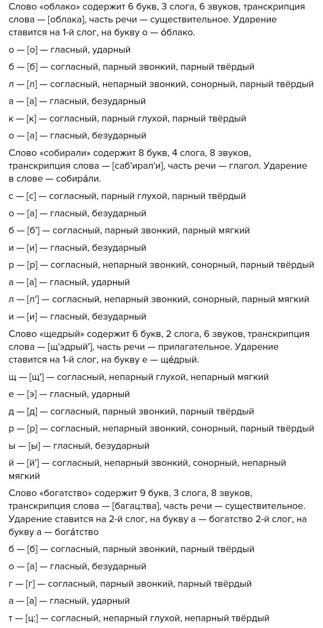 Полный фонетический разбор словУрожай,облако,собирали,щедрый,богатство,радость.
