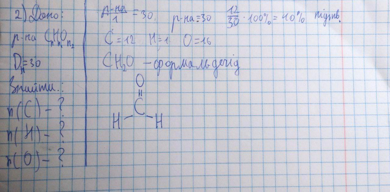 3. Органічна речовина складається з атомів Карбону, Гідрогену та Оксигену. Масові частки Карбону та Гідрогену в ній становлять відповідно 40% та 6,67%. Відносна густина парів цієї речовини за воднем становить 30. Виведіть молекулярну формулу невідомої речовини!