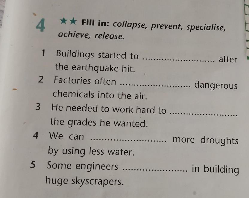 4 ★★ Fill in: collapse, prevent, specialise, achieve, release. 1 Buildings started to the earthquake hit. after 2 Factories often chemicals into the air. dangerous 3 He needed to work hard to the grades he wanted. more droughts 4 We can by using less water. 5 Some engineers huge skyscrapers. in building Плиззззз помогите