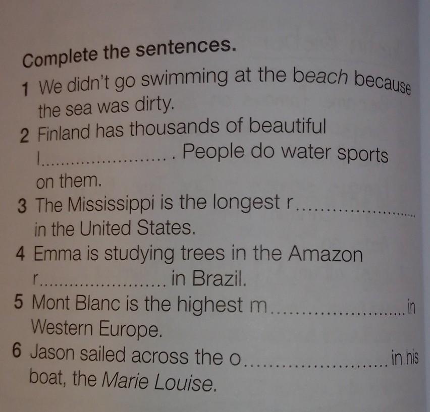 Complete the sentences. 1 We didn't go swimming at the beach because the sea was dirty. 2 Finland has thousands of beautiful People do water sports L on them. 3 The Mississippi is the longest r.. in the United States. 4 Emma is studying trees in the Amazon in Brazil. 5 Mont Blanc is the highest m... Western Europe. 6 Jason sailed across the o.. boat, the Marie Louise. .... in his