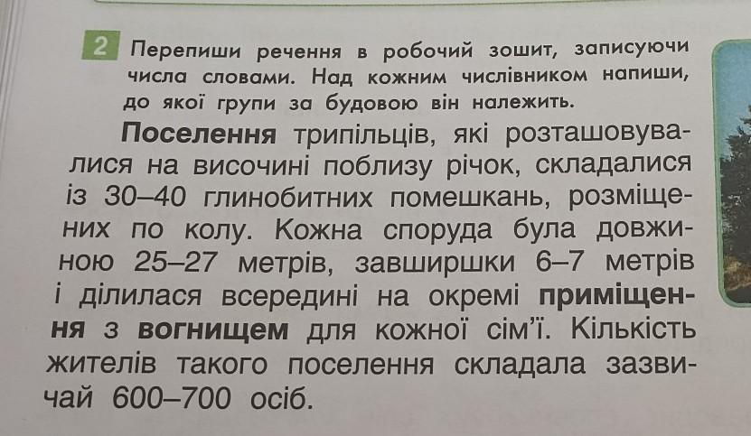 2 Перепиши речення в робочий зошит, записуючи числа словами. Над кожним числівником напиши, до якої групи за будовою він належить. Поселення трипільців, які розташовува- лися на височині поблизу рiчок, складалися iз 30-40 глинобитних помешкань, розміще- них по колу. Кожна споруда була довжи- ною 25-27 метрів, завширшки 6-7 метрів і ділилася всередині на окремі приміщен- НЯ З ВОГНищем для кожної сім'ї. Кількість жителів такого поселення складала зазви- чай 600-700 осіб. T