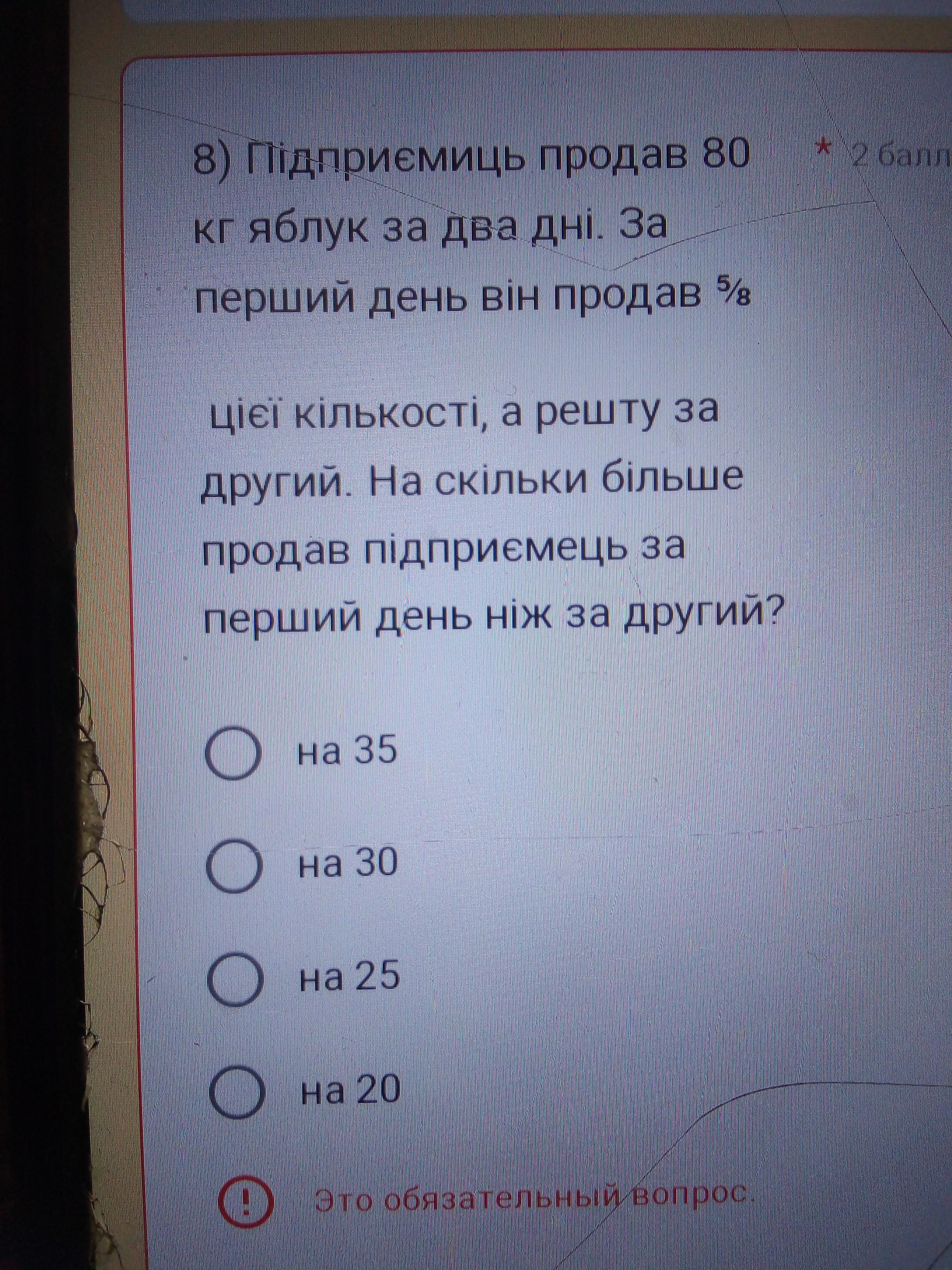 Підприємець продав 80 кг яблук за 2 дні За перший день він продав⅝ цієї кількості а решту за другий на скільки більше продав підприємець За перший день ніж за другий Допоможіть пожалуйста пожалуйста пожалуйста пожалуйста