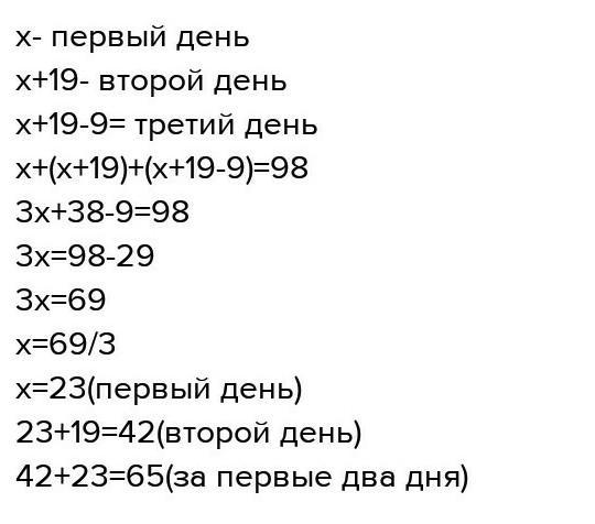 110. На фабрике по пошиву национальных костюмов за три дня еши- ли 98 костюмов, причем во второй день на 19 костюмов больше, чем в первый день, в третий день на 9 костюмов меньше, чем во второй день, 1. Сколько костюмов сшили на фабрике во второй день? 2. Сколько костюмов сшили на фабрике за первые два дня? для изгото