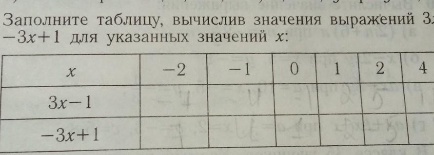 22 Заполните таблицу, вычислив значения выражений 3х-1 и -3x+1 для указанных значений х