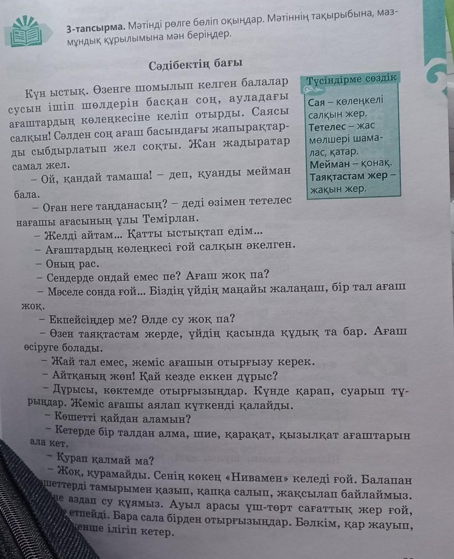 ар Ы диалог емiн- Сәдібектiн бағы Күн ыстық. Өзенге шомылып келген балалар сусын ішіп шөлдерін басқан соң, ауладағы ағаштардын коленкесiне келіп отырды. Саясы салкын! Сәлден соң ағаш басындағы жапырақтар- ды сыбдырлатып жел соқты. Жан жадыратар самал жел. деп, қуанды мейман Оған неге таңданасың? - деді өзімен тетелес нағашы ағасының ұлы Темірлан. - Желді айтам... Катты ыстықтап едім... - Ағаштардың көлеңкесі ғой салқын әкелген. - Оның рас. 3-тапсырма. Мәтінді рөлге бөліп оқыңдар. Мәтіннің тақырыбына, маз- мұндық құрылымына мән беріңдер. - - Ой, қандай тамаша! бала. 1 - - Сендерде ондай емес пе? Ағаш жоқ па? - Мәселе сонда ғой... Біздің үйдің маңайы жалаңаш, бір тал ағаш жок. Түсіндірме сөздік Сая - көлеңкелі салқын жер. Тетелес -жас мөлшері шама- лас, катар. Мейман - қонақ. Таяқтастам жер жақын жер. - Екпейсiндер ме? Әлде су жок па? Өзен таяктастам жерде, үйдің қасында құдық та бар. Ағаш есіруге болады. Жай тал емес, жеміс ағашын отырғызу керек. Айтканын жон! Кай кезде еккен дұрыс? Дурысы, көктемде отырғызындар. Күнде карап, суарып тұ- рындар. Жеміс агашы аялап куткенді қалайды. 1 Көшеттi кайдан аламын? Кетерде бiр талдан алма, шие, қарақат, кызылкат ағаштарын ала кет. Курап калмай ма? көшеттерді тамырымен казып, капка салып, жақсылап байлаймыз. Жок, курамайды. Сенің көкен «Нивамен» келеді ғой. Балапан Устіне аздап су құямыз. Ауыл арасы үш-төрт сағаттык жер гой, ештене етпейді. Бара сала бiрден отыргызындар. Бәлкiм, қар жауып, тускенше ілігіп кетер. СРОЧНО!!!