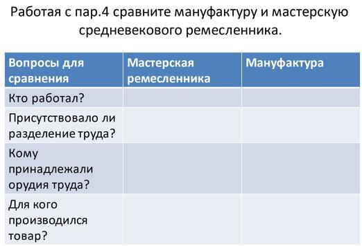 Мастерская ремесленника: Работал ремесленник, разделение труда отсутствовало,Орудия труда принадлежали ремесленнику,товар производился для покупателя.